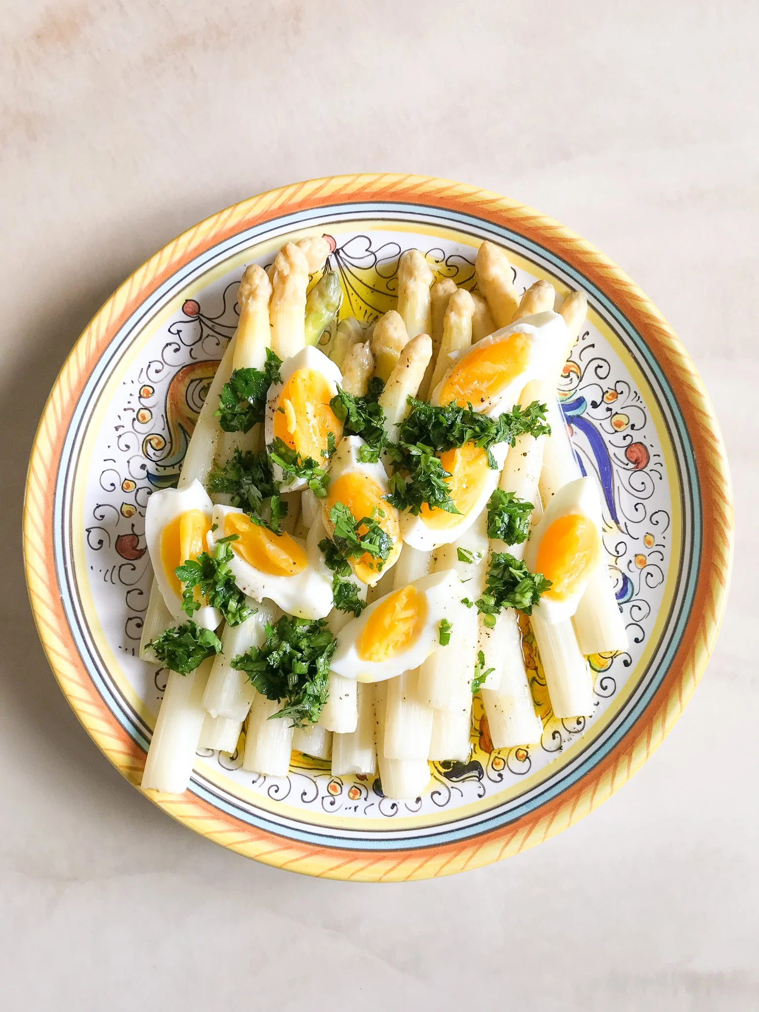 J’ai une passion pour les asperges qu’elles soient blanches, vertes, violettes, sauvages. Dès qu’elles pointent leur nez au printemps, je rentre en mode obsessionnel ! De toutes les salades que je décline pendant la saison, ma favorite est celle-ci : des œufs, une vinaigrette au curry Bombay que je compose avec Épices Roellinger et basta !